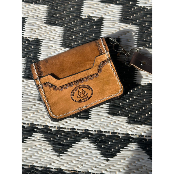 Hand tooled Leather Mini wallet with wrist strap. card pockets on back and inside