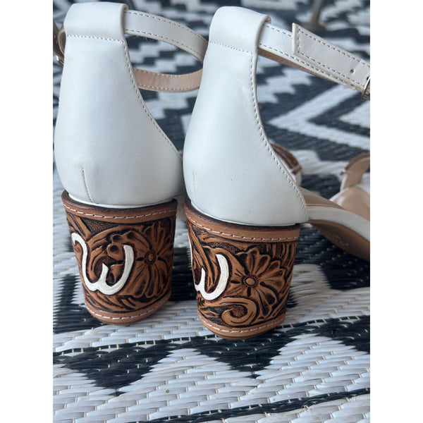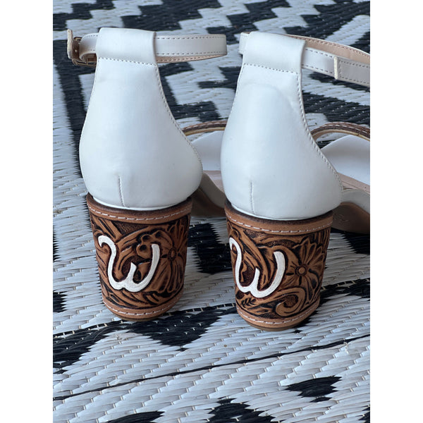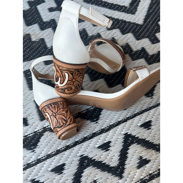 Heels with hand tooled heel and strap and your choice of design on the heel