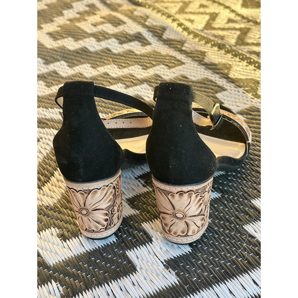 2.75 inch tall black size 8.5 open toe Tooled Heels